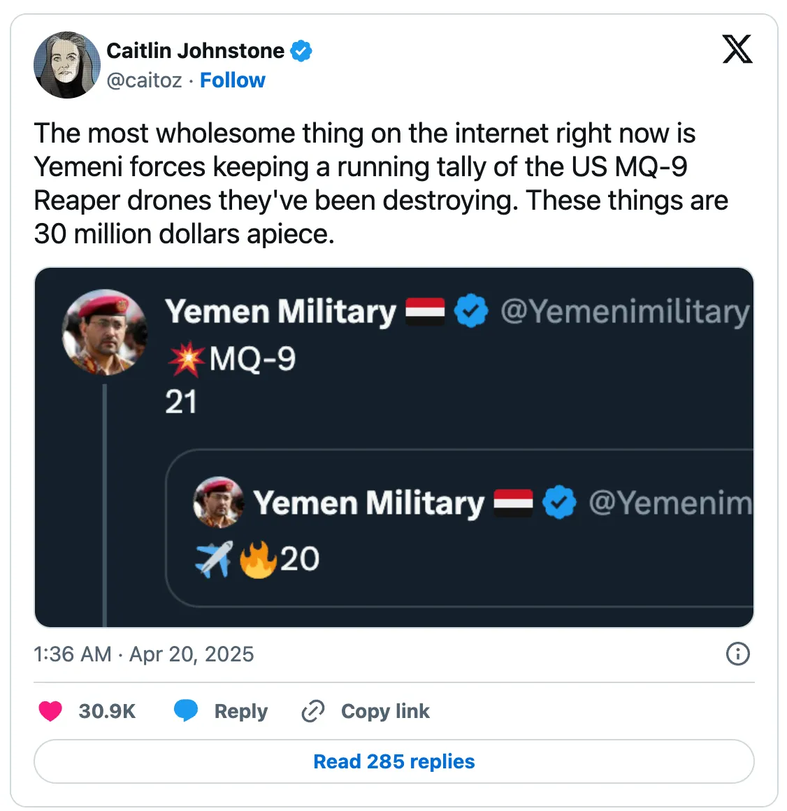 Ha 2025 áprilisában még mindig Trumpot támogatod, miután láttad az összes szörnyű viselkedését Gázában és Jemenben, akkor teljesen ellentétes oldalon állunk. Azt hiheted, hogy velem vagy egy oldalon, mert elvileg ellenzed a háborút – de amikor a kérődző elveknek össze kell csapódniuk a valósággal, kiderül, hogy bármilyen tömeges katonai mészárlást szó nélkül lenyelsz, nem számít, mennyire gonosz, amíg egy republikánus csinálja. Nem szövetségesek vagyunk, hanem ellenségek. Te a világ legpiszkosabb háborús uszítója mellé állsz, és én azt akarom, hogy a te oldalad bukjon meg.