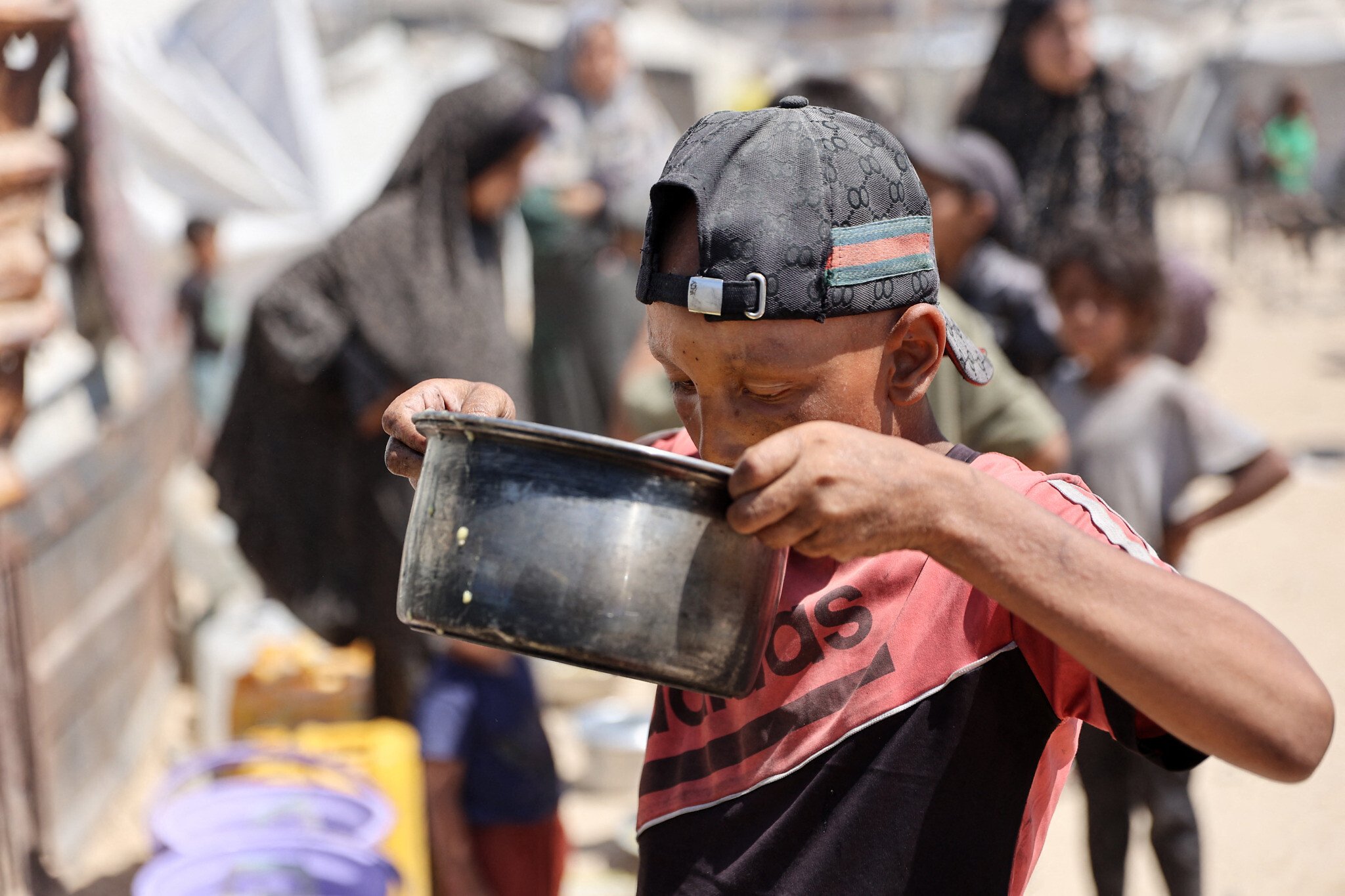 Egy palesztin fiú lencselevest iszik, amit egy gázai élelmiszerelosztó központból szerzett be 2025. augusztus 1-jén. (Fotó: Omar AL-QATTAA / AFP)