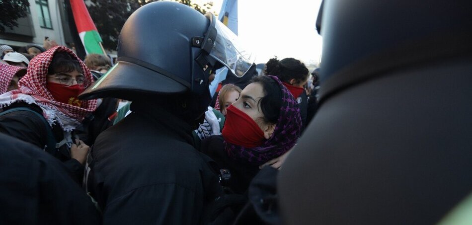 Ismétlődően hallatszottak a „Free, free Palestine”, „Viva, viva Palästina” és „Hoch die internationale Solidarität” (Éljen a nemzetközi szolidaritás) skandálások. A tüntetést elsősorban a 2023 óta a szolidaritási mozgalomban aktív migráns szervezetek, baloldali csoportok, a békemozgalom szervezetei és a Baloldali Párt fiatalabb tagjai tartották, akiknek a blokkja körülbelül 3000–4000 tüntetőt számlált. A Lustgarten szélén, a rendőrségi kordon mögött körülbelül 50 ellentüntető gyűlt össze. Itt izraeli zászlók és egy „Omas gegen rechts” (Nagymamák a jobboldal ellen) feliratú transzparens volt látható.