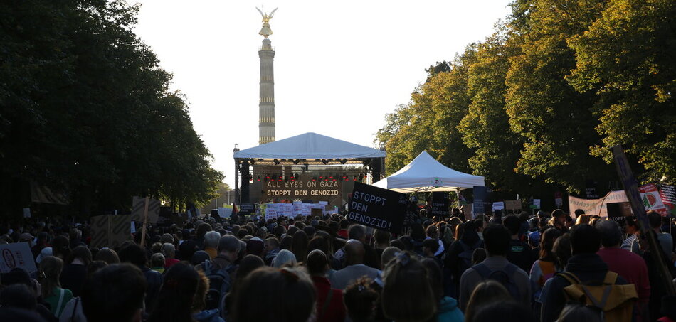 Több tízezer ember tüntetett szombaton Berlinben és Düsseldorfban Izrael Gázával szembeni háborúja ellen. A legnagyobb tüntetés, a „Zusammen für Gaza” (Együtt Gázáért) délután kezdődött Berlin központjában, a Vörös Városháza közelében. A tüntetésre körülbelül 50 szervezet, köztük a Medico International, az Amnesty International és a Németországi Palesztin Közösség hívott fel. A Die Linke párt is, miután közel két évig tartózkodott a palesztin szolidaritási mozgalomtól, végül úgy döntött, hogy támogatja a tüntetést. Moritz Krawinkel a Medicótól a jW-nek elmondta, hogy azért vannak itt, „hogy felhívják a figyelmet a népirtásra, és remélhetőleg elérjék, hogy a német támogatás megszűnjön, és véget érjen ez a népirtás”.