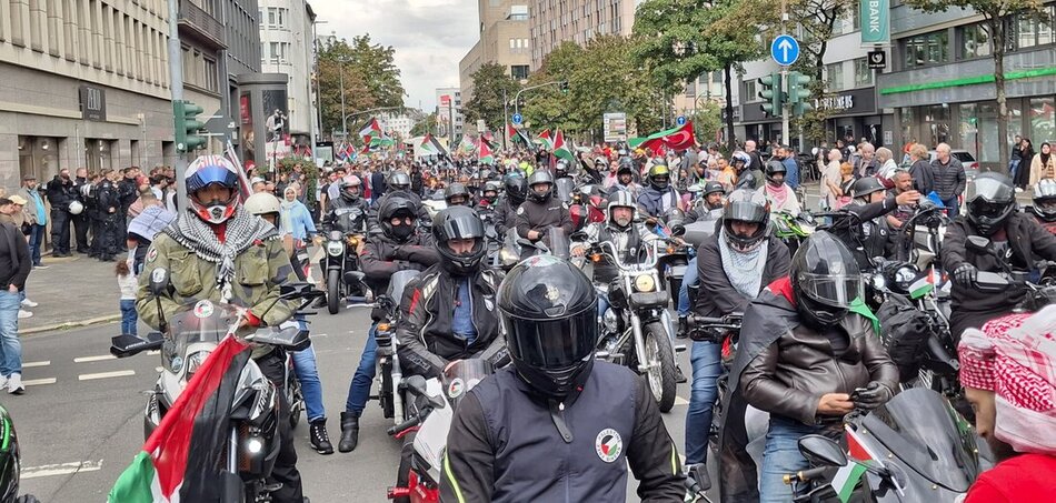 Düsseldorfban szombaton a szervezők szerint körülbelül 30 000 ember tüntetett „Nem felejtjük el Gázát – Szabadságot Palesztinának és minden elnyomott népnek” jelszóval a főpályaudvartól a belvárosig. A rendőrség jelentős erőkkel volt jelen; előzetesen nem érkezett jelentés incidensekről. A felszólalók között voltak a düsseldorfi palesztin közösség és a Gázai övezet felé tartó Global Sumud Flotilla képviselői. A tüntetést a „Bikers4Palestine” csoport mintegy 50 motorosa vezette. A rendőrség a tüntetés feloszlatásával fenyegetve megtiltotta a szervezők által tervezett élő közvetítést Gázába és a Sumud Flotillára.