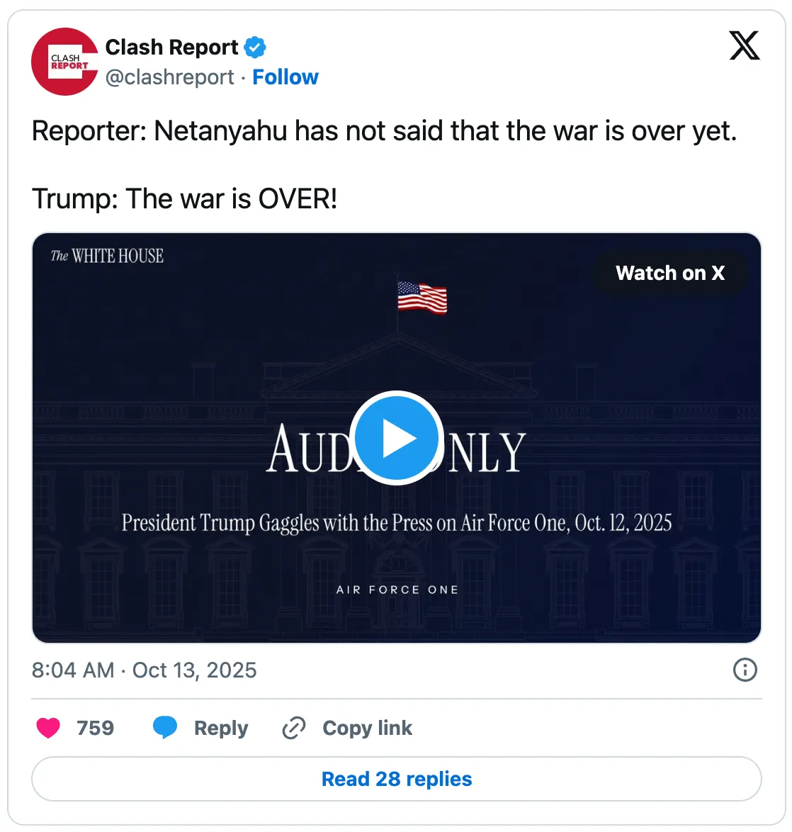 Amikor a sajtó megkérdezte Netanjahu azon vonakodásáról, hogy kimondja, véget ért a gázai „háború”, Trump határozottan kijelentette: „A háborúnak vége. A háborúnak vége, oké? Érted?”