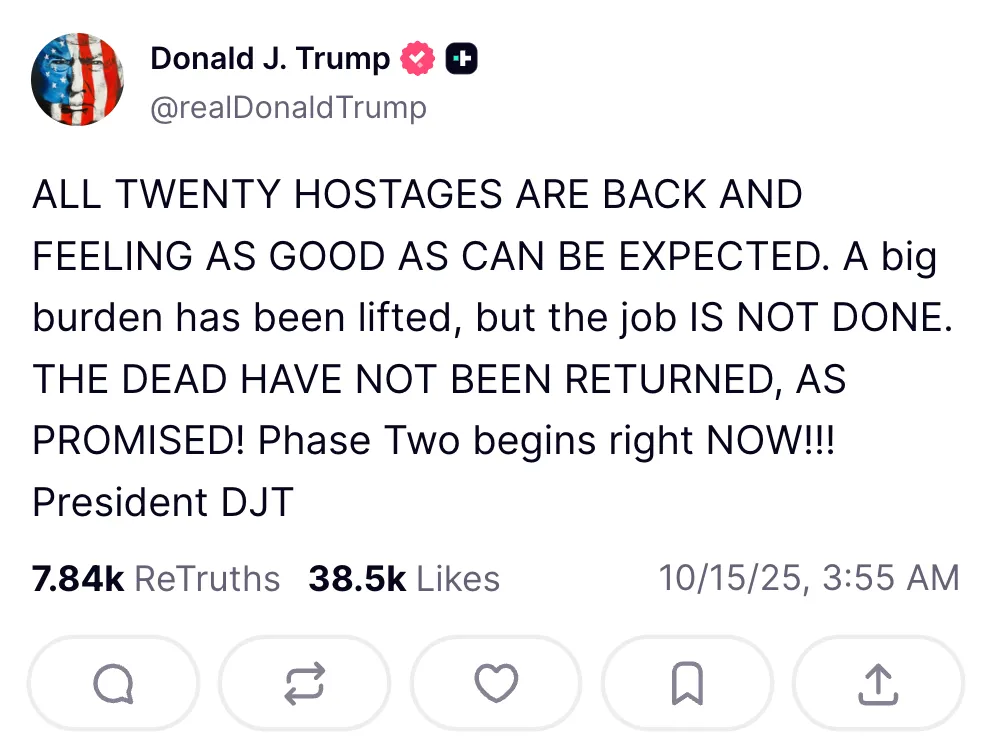 És úgy tűnik, Trump elnök is egyetért ezzel, a Truth Socialon azt //truthsocial.com/@realDonaldTrump/posts/115373569028997850">írta, hogy „Egy nagy terhet vettek le róluk, de a munka NEM BEFEJEZETT. A HALOTTAK NEM TÉRTEK VISSZA, AHOGY ÍGÉRTÉK!”