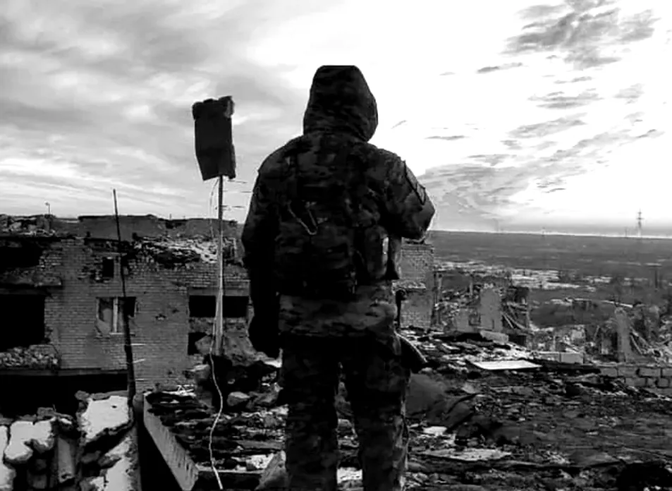 Egy orosz katona a naplementét nézi egy másik elfoglalt donyecki város romjai között a fronton.