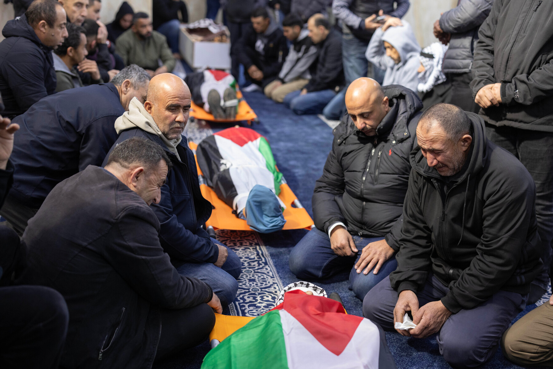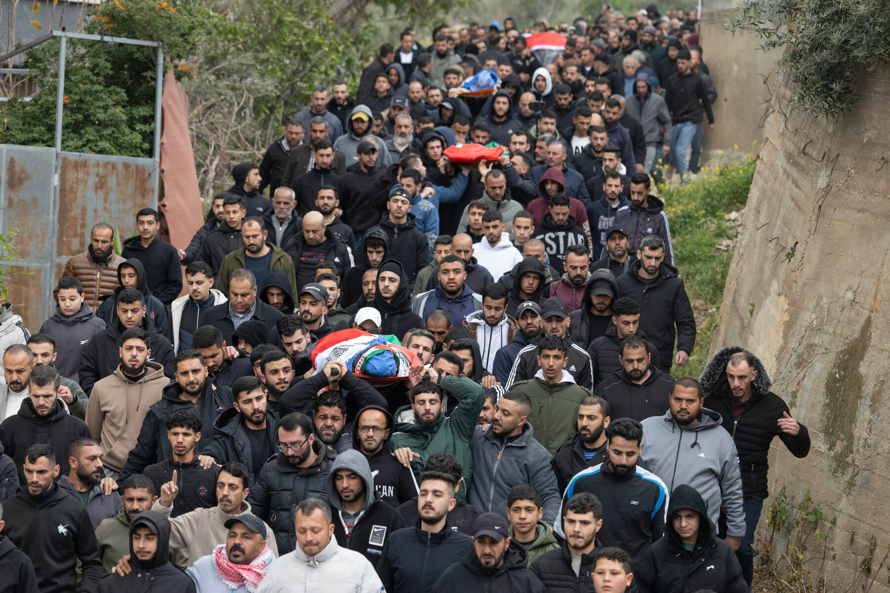 Palesztinok gyászolják a március 8-án Khirbet Abu Falah-ban, a ciszjordániai Rámalláh közelében lévő izraeli telepesek támadásában meghalt három férfit. A fegyveres telepesek tüzet nyitottak a lakosokra, megölve Thaer Hamayelt és Fare Hamayelt. Egy harmadik lakos, Muhammad Morah, miután belélegzte az izraeli erők által kilőtt könnygázt. ActiveStills