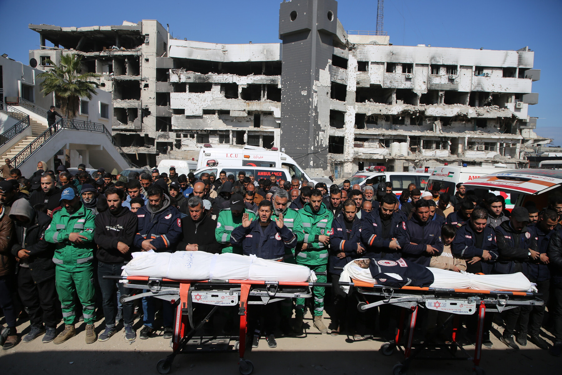 Emberek gyászimádságot mondanak a gázai Al-Shifa Kórház előtt március 9-én három emberért, köztük egy mentősért, akik az előző este egy izraeli légicsapásban vesztették életüket Gáza városától nyugatra. APA képei