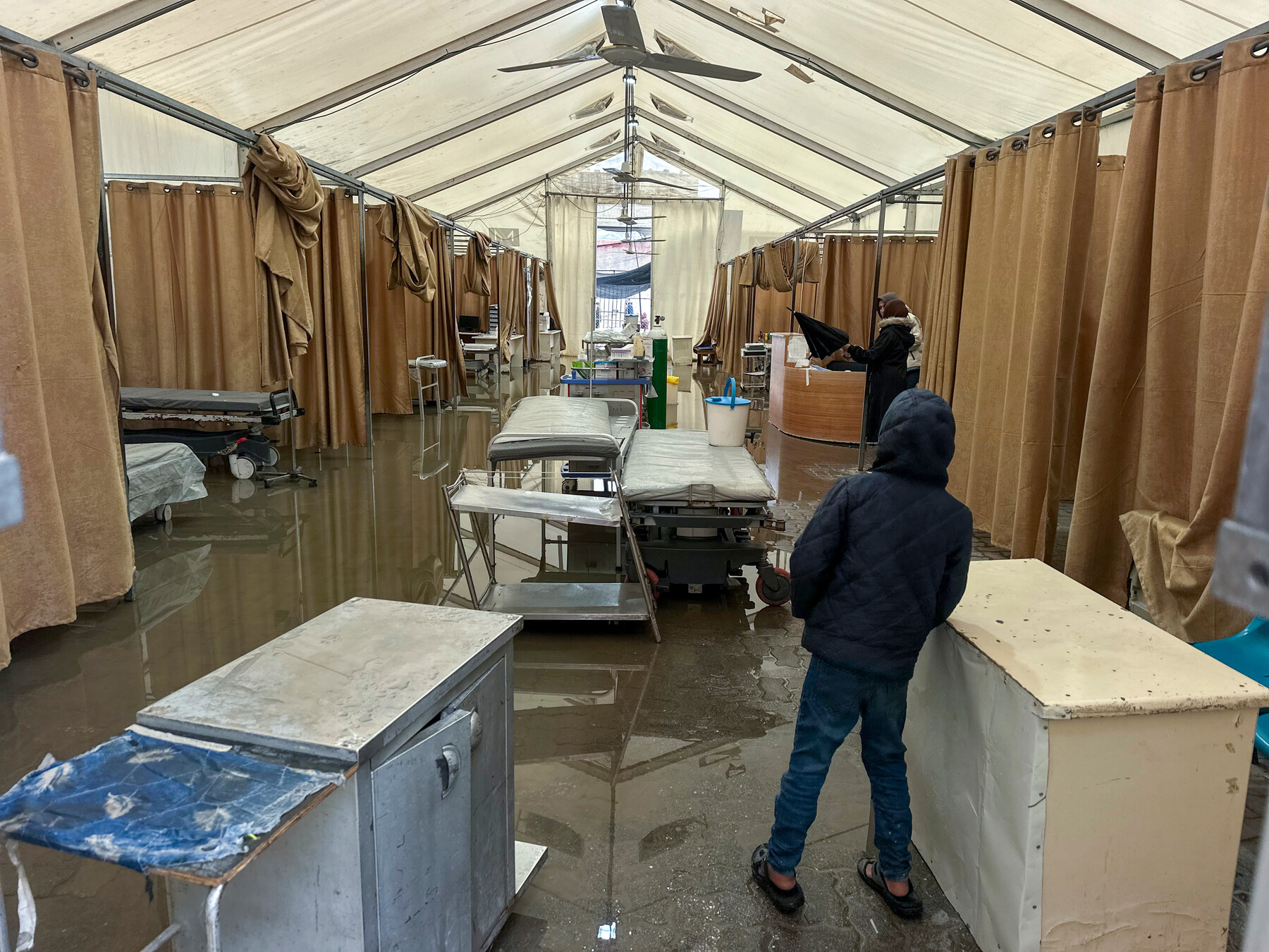 Elárasztott tábori kórház a Nasszer Orvosi Komplexumban, Khan Younisban, Dél-Gázában, március 26-án. Az árvíz létfontosságú berendezéseket rongált meg, súlyosbítva az amúgy is kritikus erőforráshiányt. ActiveStills