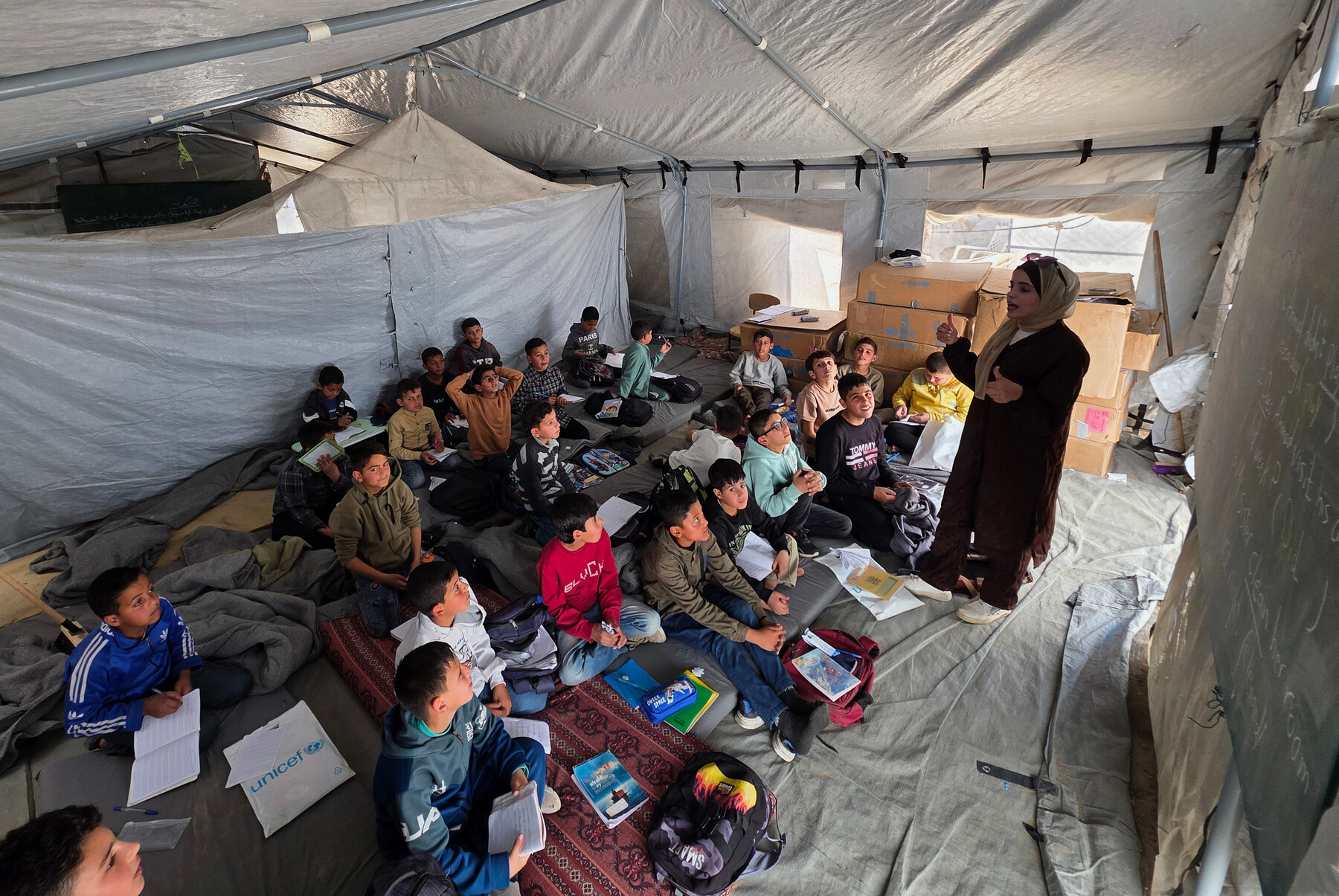 Diákok vettek részt egy órán egy rögtönzött tanteremben Khan Younisban, a Gázai övezet déli részén, ahol hiányoztak az alapvető kellékek, például írószerek és padok, március 28-án. APA képek