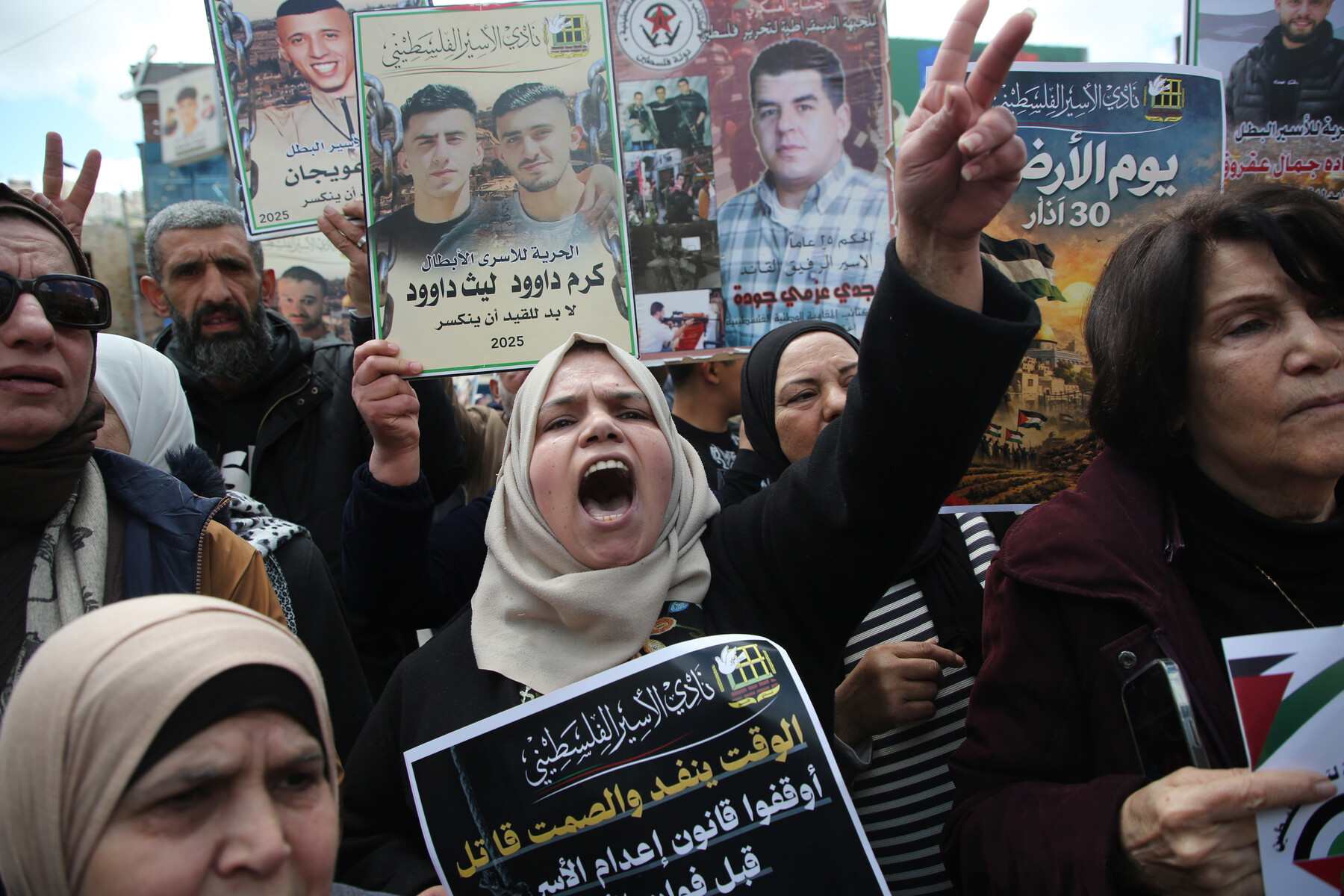 Izrael által fogva tartott foglyok családjai tiltakoznak egy új izraeli törvény ellen, amely előírja a palesztin foglyok kivégzését „terrorista” bűncselekmények miatt, Nablusz, Ciszjordánia, március 31. APA képek