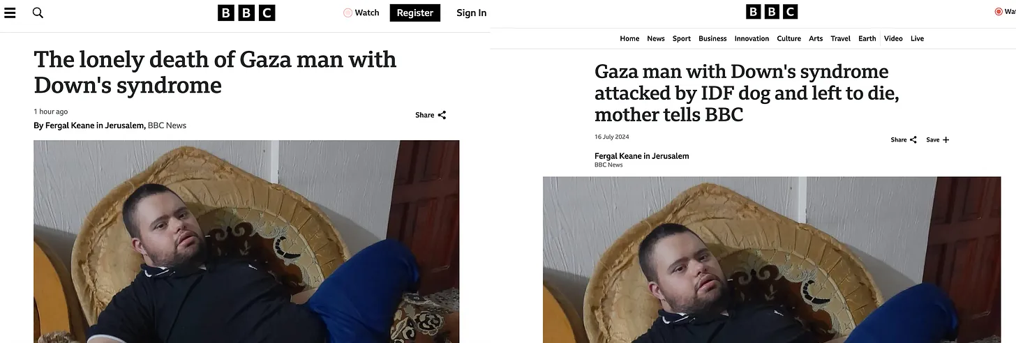 Végül a BBC úgy döntött, hogy átírja a történetet. A főcímet megváltoztatta: „A Down-szindrómás gázai férfit megtámadta az IDF kutyája és hagyták meghalni, az anya elmondta a BBC-nek”. Két új bekezdést is beillesztett a cikk elejére, amelyben arról tájékoztatta az olvasókat, hogy az izraeli hadsereg elismerte, „hogy egy Down-szindrómás palesztin férfit, akit a hadsereg kutyája támadott meg Gázában, a katonák magukra hagytak, miután a családját távozásra utasították”, és hogy „egy héttel később a családja holtan találta”. Még az új megfogalmazással együtt is azt sugallta a cikk, hogy a kutya önszántából támadt Bhar-ra, nem pedig azt, hogy az IDF személyzete irányította.