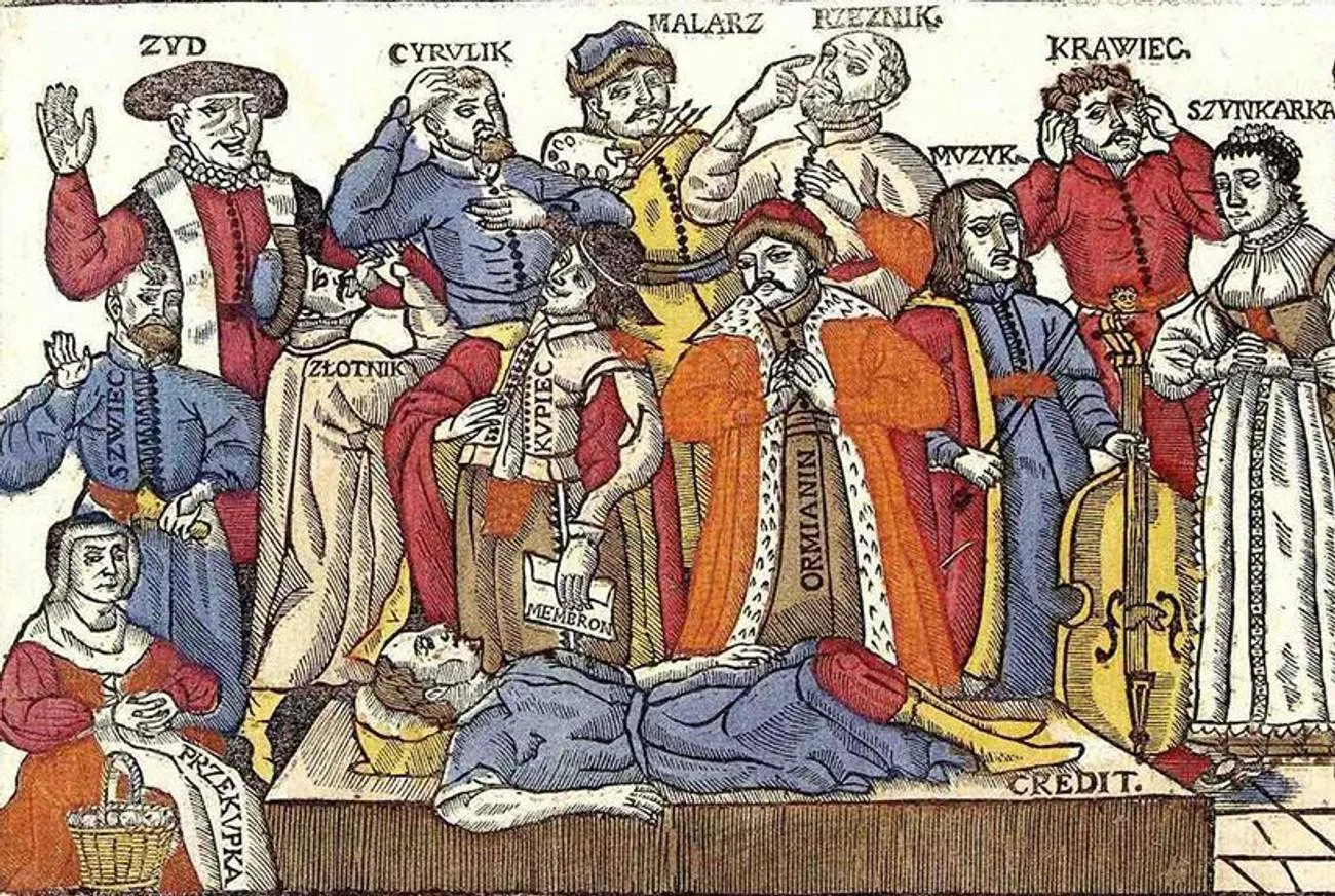 Ez a tizenhetedik századi fametszet a lengyel-litván társadalom különböző tagjait ábrázolja. A zsidó (Zyd) látható a bal felső sarokban. Nem érdekes, hogy csak ő és a kereskedő mosolyognak? Bár valójában, ahogy hamarosan látni fogjuk, a lengyel kereskedőknek nem sok okuk volt az örömre.