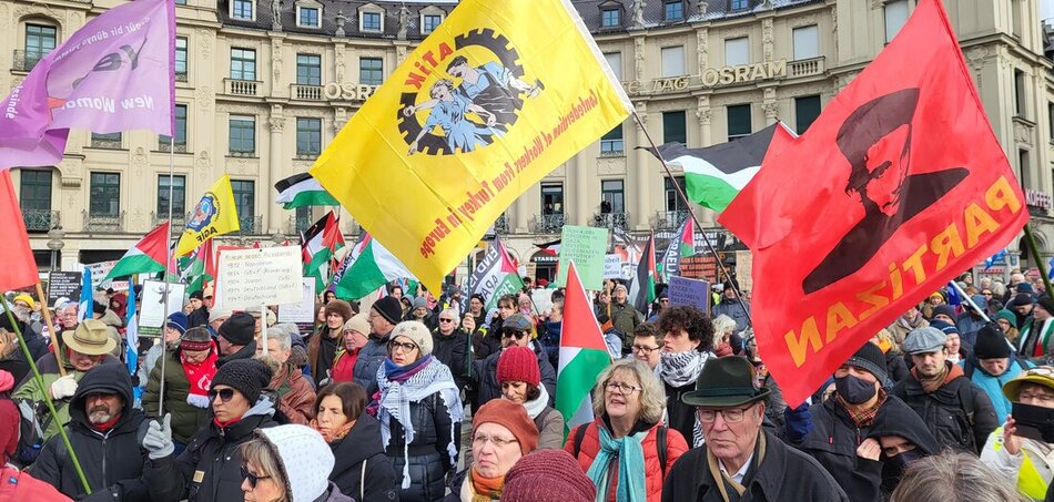 Hangos lett, amikor a baloldali tüntetés gyűlése mellett az Odeonsplatz-on elhaladt egy több száz ukrán és támogató - köztük a kis liberális Volt párt képviselőinek egy tömbje. Miután az ottani tömeg a „Taurus - Taurus” és a „Slava Ukraini” fasiszta tisztelgést skandálta, a Feldherrenhalle előtt felszólaló Oelsii Makeiev ukrán nagykövet az ukrán tüntetők éljenzése közepette kijelentette, hogy az Unió kancellárjelöltje, Friedrich Merz a Bayerischer Hof-ban megígérte neki a mélyen Oroszországba nyúló „Taurus” fegyverrendszer átadását. A nagykövet köszönetet mondott „Németországnak a fegyverekért, amelyekkel az önök nevében háborút folytatunk az oroszok és Oroszország ellen”.