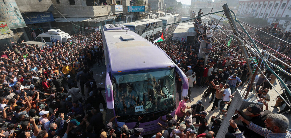 Izrael összesen 1966 palesztint enged szabadon. Miután a 20 élő izraeli túsz hétfő reggel átadásra került a Vöröskereszt Nemzetközi Bizottságának, délben az első buszok elindultak az izraeli Ofer börtönből a megszállt Ciszjordániába. Röviddel ezután a Negev börtönből is buszok indultak a Gázai övezet felé. A 250 életfogytiglanra ítélt fogoly közül több mint 150-et száműztek Egyiptomba, 88-at a megszállt Ciszjordániába, nyolcat pedig Gázában engednek szabadon. A Hamász fegyveres szárnya bejelenti, hogy még hétfőn átadja négy izraeli fogoly holttestét. További részleteket egyelőre nem közöltek. Összesen még 28 holttest van a Gázai övezetben.