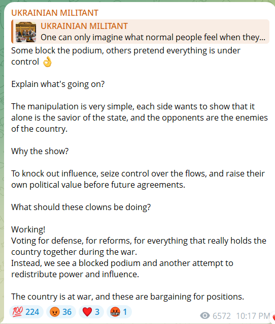 Az ukrán militaristák pedig minden bizonnyal undorodnak a Zelenszkij elleni ellenzéktől. Az Ukrainian Militant, egy GUR-tiszt által működtetett Telegram-csatorna így vélekedett az ukrán parlament (rada) mai eseményeiről: