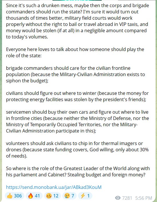 Az azovi közösségben biztosan vannak olyan hangok, amelyek nyíltan katonai diktatúrát követelnek. Mindig szívesen olvasom a Tales of the IV Empire (korábban „of the IV Reich”) telegram-csatornát, amely valószínűleg az intellektuálisan legfejlettebb azovi szócső az interneten. November 16-án a Tales felszólította a hadtest- és dandárparancsnokokat, hogy vezessék az államot, mint hatékonyabb alternatívát a jelenleg hatalmon lévő korrupt, inkompetens tisztviselőkkel szemben: