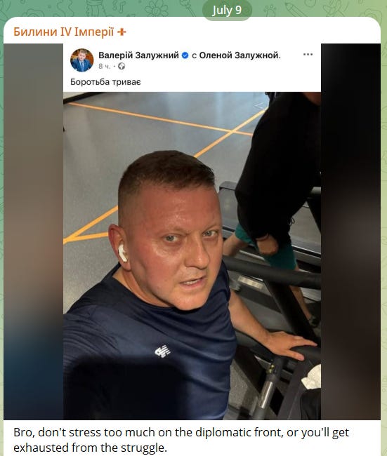 2. Zaluzsni felkészülten találkozott az oroszokkal. Az eredmények meghaladják önmagukat: Mariupol bekerítve, orosz csapatok Zaporizsja és Kijev külvárosában, orosz csapatok Szumi és Csernihiv külvárosában, Berdiansk, Melitopol, Chongar, Nova Kahovka, Tokmak és Enerhodar mind elvesztek – mindez az ő „vezetésének” eredménye a háború első hetében.