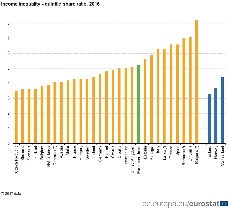 Komoly különbségek voltak a jövedelemeloszlás terén 2016-ban, az uniós tagországok népességének legmagasabb jövedelemmel rendelkező 20 százaléka (azaz a legjobban keresők) csaknem 5,2-szer kerestek többet, mint a legalacsonyabb jövedelemmel rendelkezők (a népesség szintén 20 százaléka) – derült ki az Európai Unió statisztikai hivatala, az Eurostat felméréséből. Egy évvel korábban szintén 5,2-szeres volt a különbség, míg 2010-ben ugyanez 4,9 volt.
