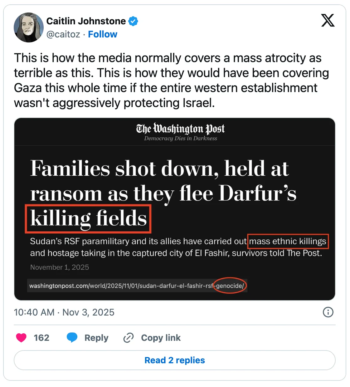 Jó, hogy a nyugati sajtó tényleges újságírást folytat Szudánban, és a szokásos sürgősséggel és hangsúllyal tudósít a népirtásról. Ha az elmúlt két évben ugyanígy tudósítottak volna Gázáról, a Nyugat Izrael iránti támogatása mára teljesen összeomlott volna.