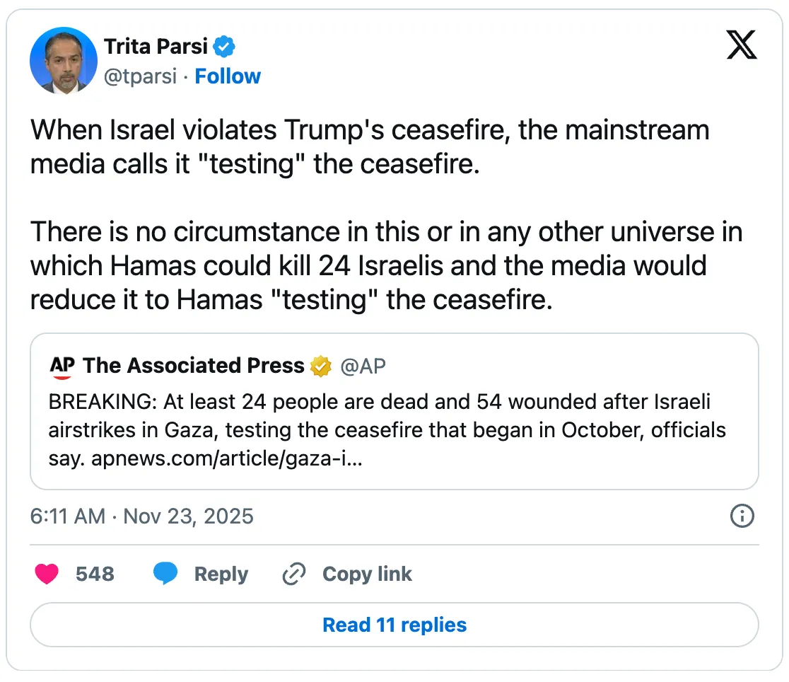 A birodalmi média végig így festette be Izrael tűzszünet-sértéseit. A minap az NBC News egy másik gázai mészárlásról szóló riportot közölt „Izraeli légicsapások 25 palesztint öltek meg Gázában, megrengetve a törékeny tűzszünetet” címmel. A múlt hónapban a CNN egy olyan címsort közölt, amelyben azt állította, hogy „az USA közvetítésével létrejött tűzszünet látszólag túlélte az első nagyobb próbát ”, miután Izrael legalább 44 embert megölt, miközben addig minden egyes nap megsértette a tűzszünetet.