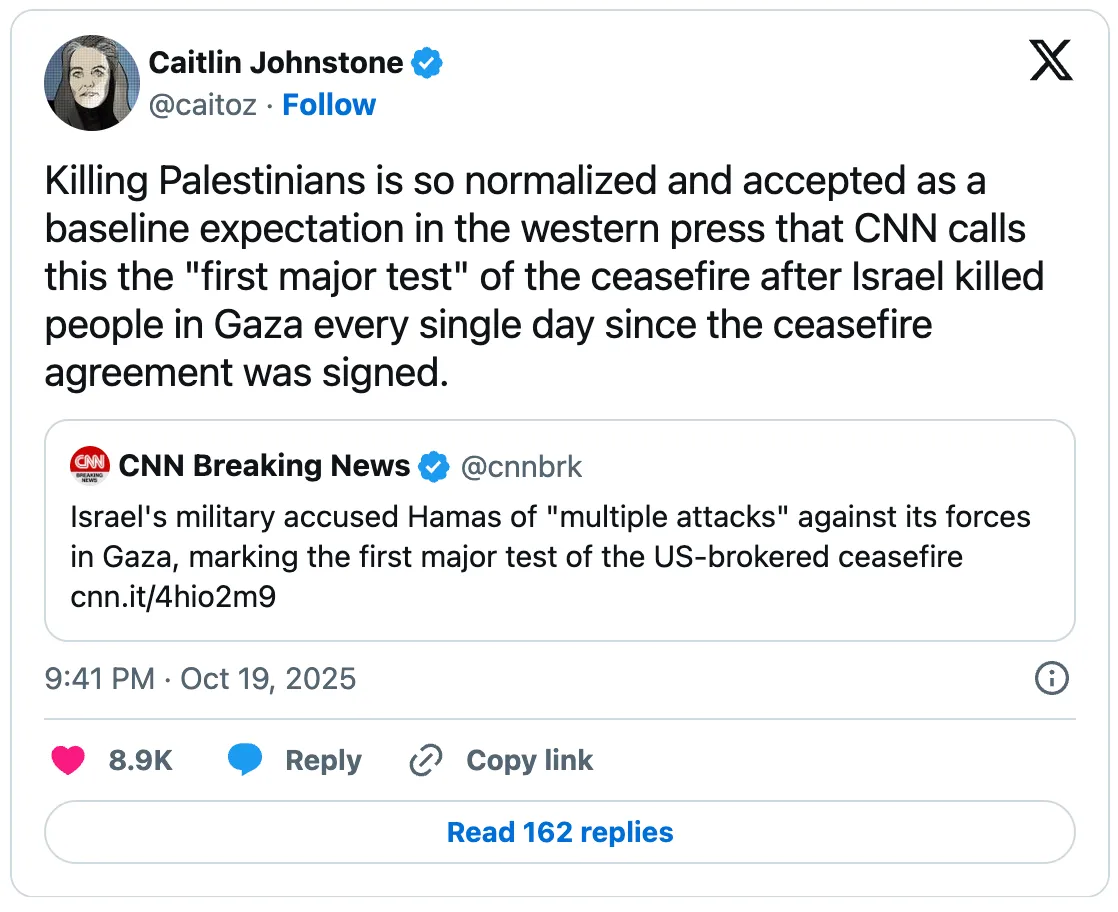 Soha nem sérti meg a tűzszünetet a palesztinok elleni tömeggyilkosság. Ez mindig csak a tűzszünet „próbája”, vagy valami, ami „egy törékeny tűzszünet közepette” történik. Ha a Hamász hirtelen megtámadna és megölne több tucat izraelit, ezek a birodalom-propagandisták nem azt mondanák: „Hmm, remélem, a törékeny tűzszünet kitart ebben a nehéz próbatételben.” Csak annak neveznék, ami. És ez lenne a világ fő híre.
