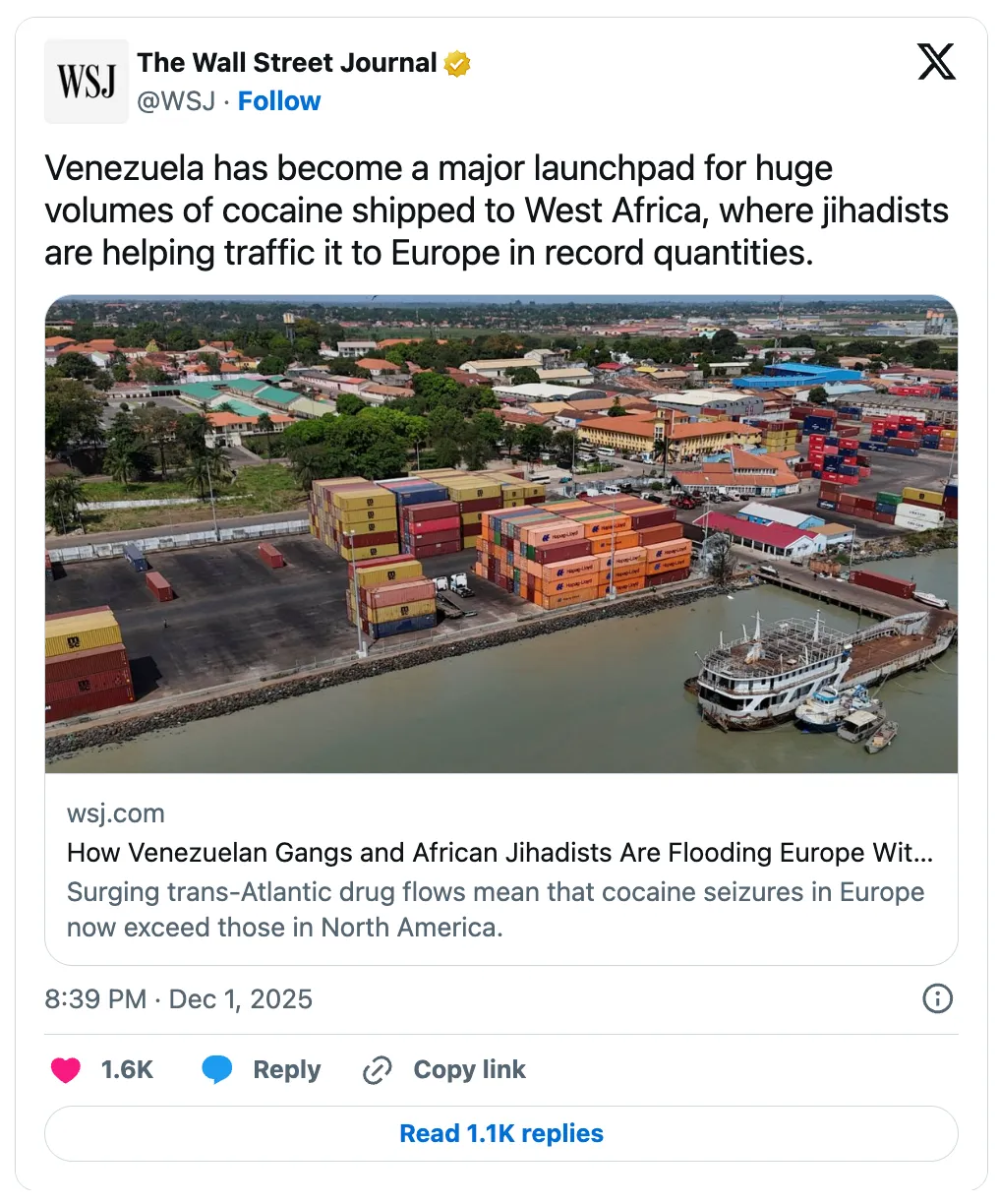 „Venezuela jelentős indítóbázissá vált a Nyugat-Afrikába szállított hatalmas mennyiségű kokain számára, ahonnan a dzsihadisták rekordmennyiségű kokainszállítást tesznek lehetővé Európába” – kezdődik a cikk, és kiemeli, hogy „a Trump-adminisztráció nyomásgyakorló kampánya Nicolás Maduro venezuelai vezető ellen – akiről azt állítja, hogy jelentős szerepet játszik a kábítószer-csempészetben – felhívta a globális figyelmet az ország kábítószer-kereskedelemben betöltött szerepére”.
