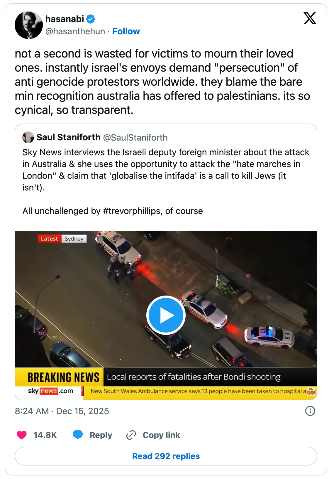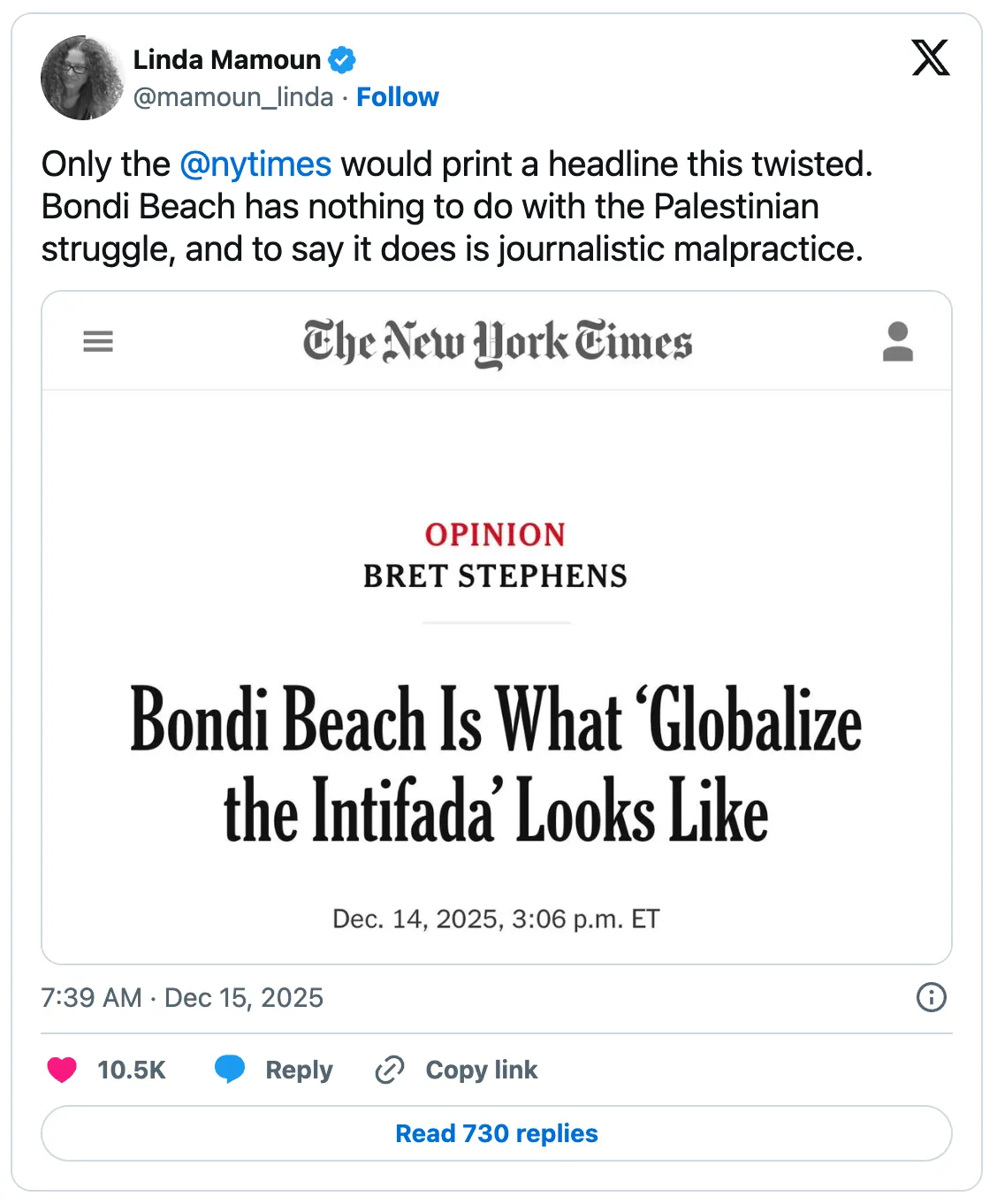 Bret Stephens, a New York Times háborús uszítója írt egy cikket „Bondi Beach, milyennek tűnik az „Intifáda globalizálása”, címmel, azzal érvelve, hogy a lövöldözők „a szívükre vették az olyan szlogeneket, mint az „ellenállás jogos” és a „minden szükséges eszközzel”, amelyek világszerte mindenütt jelen vannak az Izrael-ellenes tüntetéseken”.