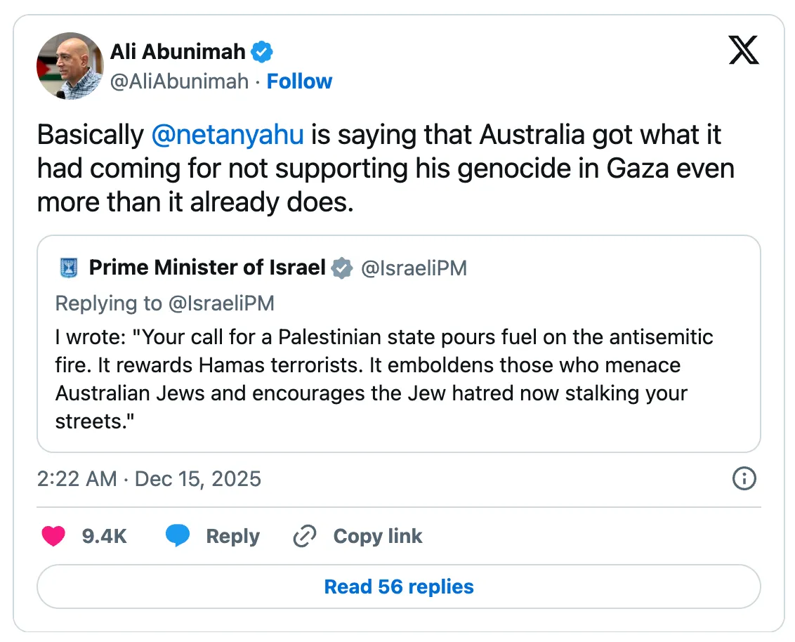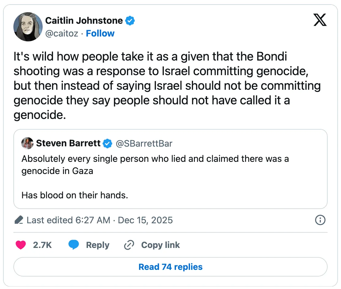 A civilek lemészárlása helytelen. Helytelen Bondi Beachen, és helytelen Gázában. Ma a világ legrosszabb emberei azt próbálják állítani, hogy mivel az előbbi megtörtént, mindenkinek abba kell hagynia az utóbbi elleni tiltakozást. Ez tiszta, cinikus manipuláció, amelynek célja, hogy megvédje a népirtó apartheid államot a kritikától. Nem érdemel mást, csak gúnyt és elutasítást.