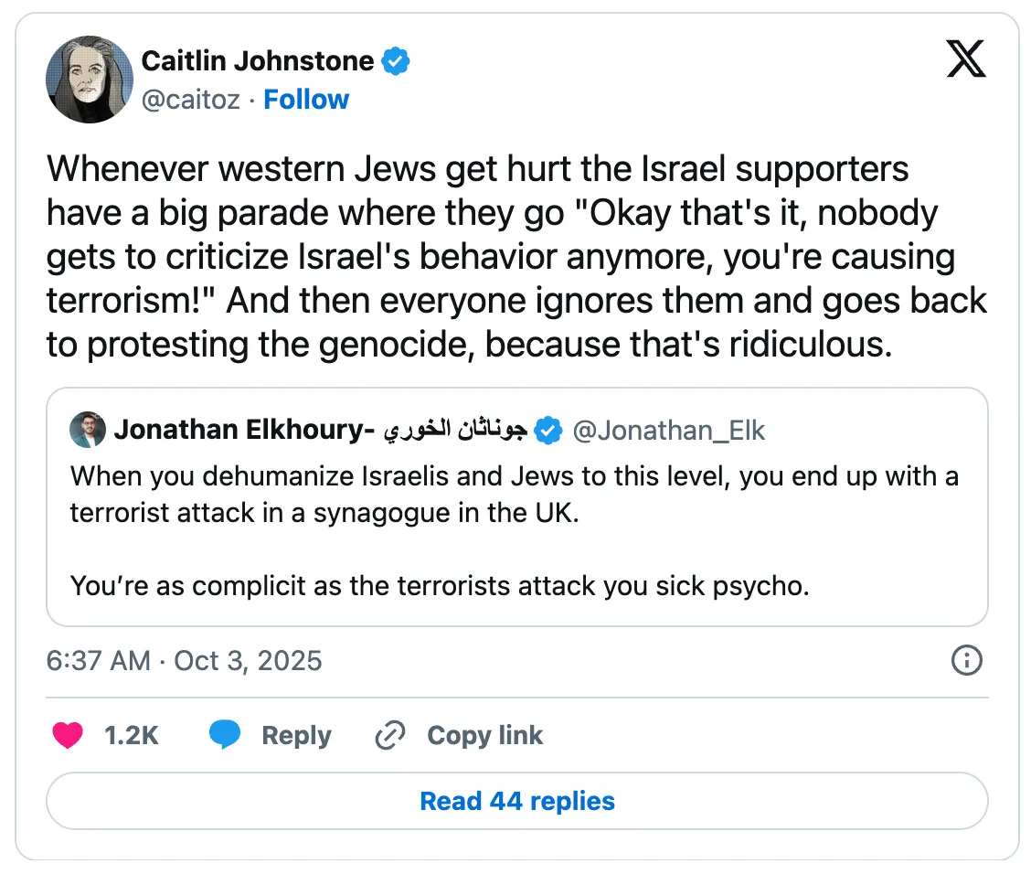 A tavaly októberi manchesteri zsinagógatámadás után azt a megfigyelést tettem, hogy „manapság, amikor nyugati zsidók megsérülnek, mindig látni az Izrael-szurkolókat, akik nagy felvonulást tartanak, ahol azt mondják: »Oké, ennyi, fejezzük be, senki sem kritizálhatja többé Izrael viselkedését, mert terrorizmust szítotok!« Aztán mindenki figyelmen kívül hagyja őket, és visszatér a népirtás elleni tiltakozáshoz, mert ez nevetséges.”