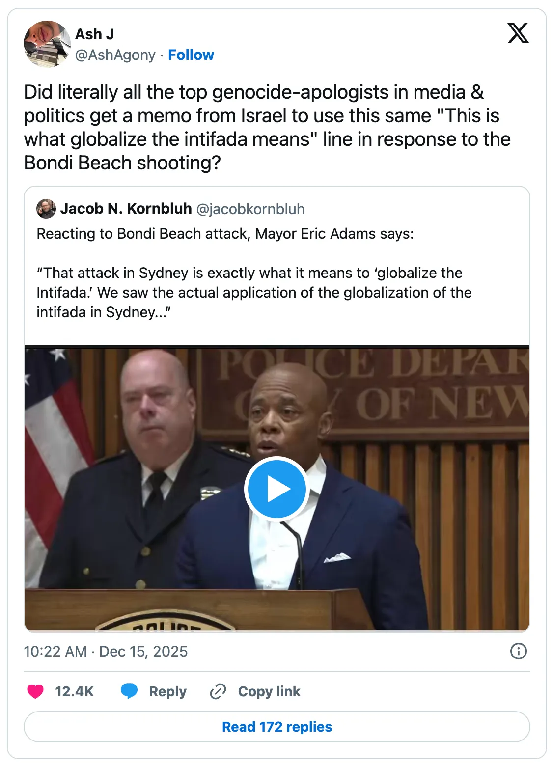 „Miért engedélyezett ez még mindig? Mit jelent az intifáda globalizálása? Elmondom én, mi a jelentése… ez történt tegnap a Bondi Beachen.”