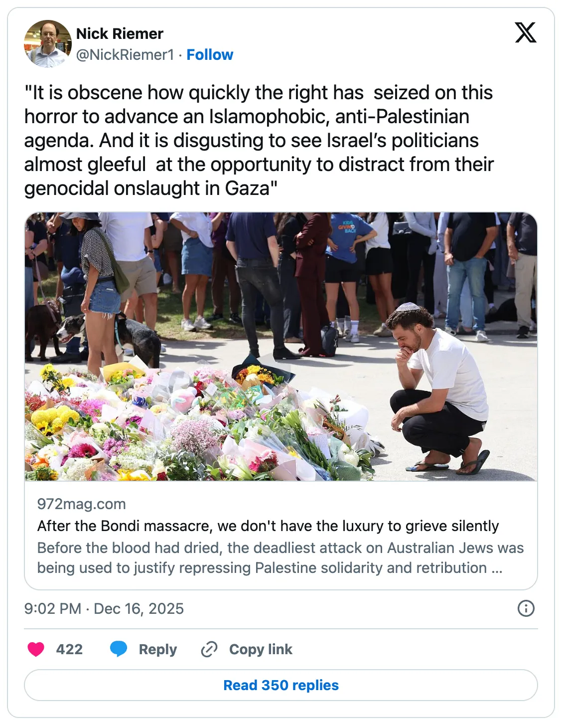 „Amikor nem ítéli el, és csak „bátortalanítja” az »Intifáda globalizálása« kifejezés használatát, akkor elősegíti (nem pedig előidézi) azt a gondolkodásmódot, amely a Bondi Beachhez vezet.”