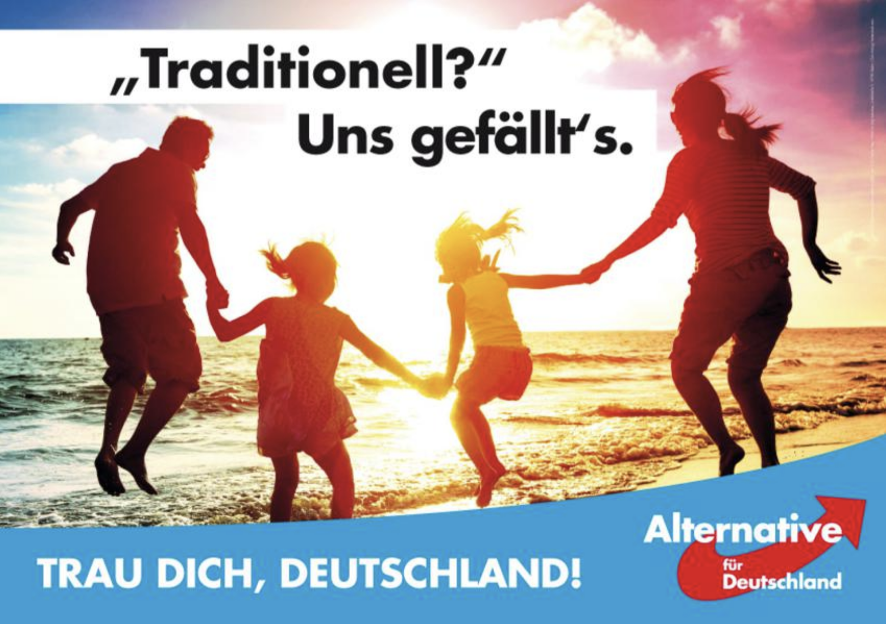 Kezdjük az "AfD stílusára" legjellemzőbb plakáttal. A felszínen egy családot ábrázol. Két szülő fagyott mosollyal és kissé nyugtalanító megjelenéssel. Kezük összeér, hogy egy tetőt formáljanak. A probléma: a felfelé nyújtott karok kicsit túlságosan is kifejezetten a náci tisztelgésre emlékeztetnek. De vajon ez egy náci tisztelgés? Ebben a résben csúszik át az üzenet, egy abszolút tabuval játszva, amit az AfD már nem fél megközelíteni.
