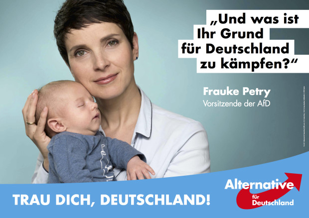 "És mi késztet arra, hogy Németországért harcolj?" Frauke Petry, az AfD akkori vezetője ezen a plakáton saját gyermekével pózol. Célja: levetkőzni rideg imázsát.
