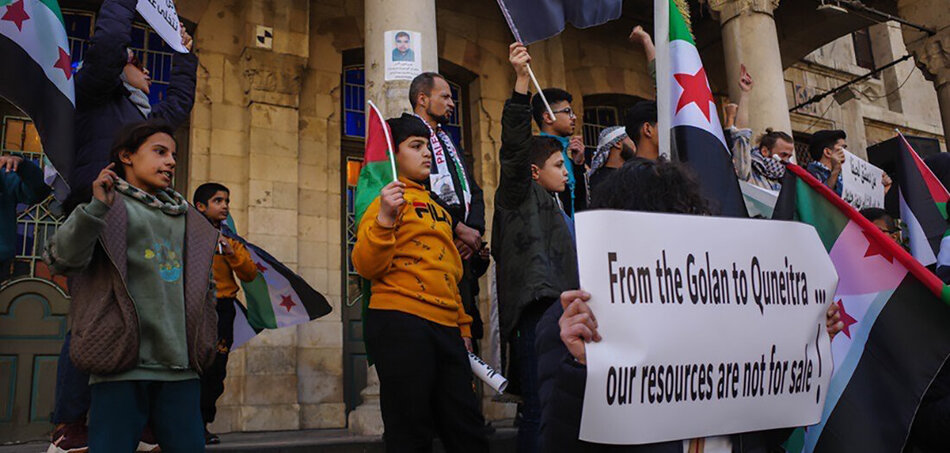 Kép: John McAulay „A Golántól Kuneitráig - erőforrásaink nem eladóak”: tüntetés a megszállás ellen Damaszkuszban