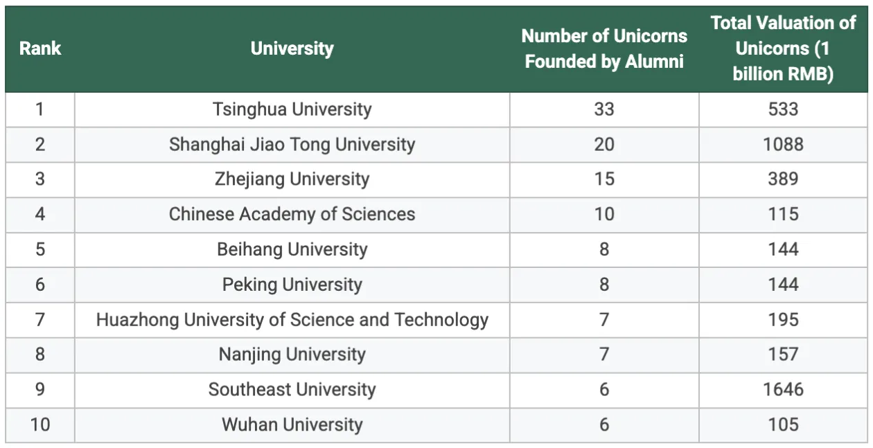 A 2024-es év legjelentősebb kínai egyetemei az unikornis inkubációs kapacitás tekintetében (az előállított unikornisok száma alapján rangsorolva), a XinCaifu magazin által közzétett eredeti Top 50 táblázat alapján; archívum