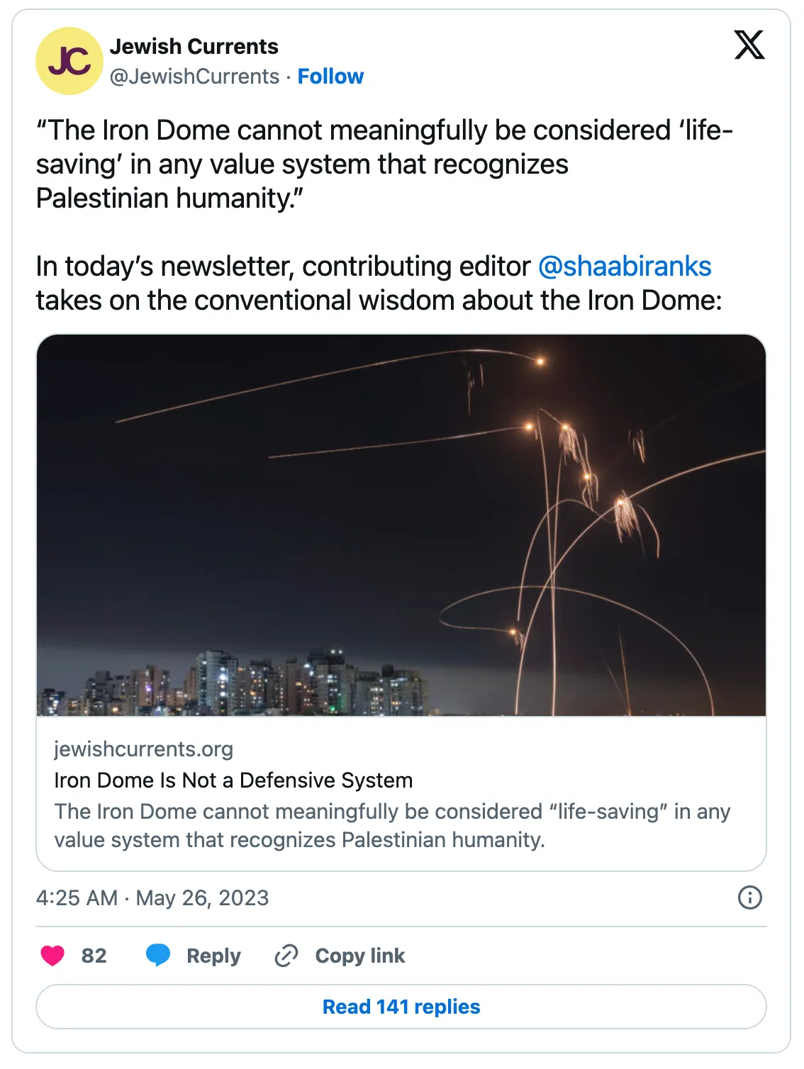 A Jewish Currents című lapban megjelent „Az Iron Dome nem védelmi rendszer” című cikkében Dylan Saba így magyarázza: