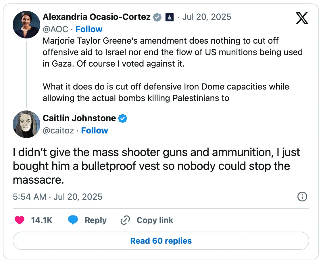 Forrás: https://www.caitlinjohnst.one/p/aoc-is-a-genocidal-con-artist?utm_source=share&utm_medium=android&r=2cxqch&triedRedirect=true 2025. július 20.