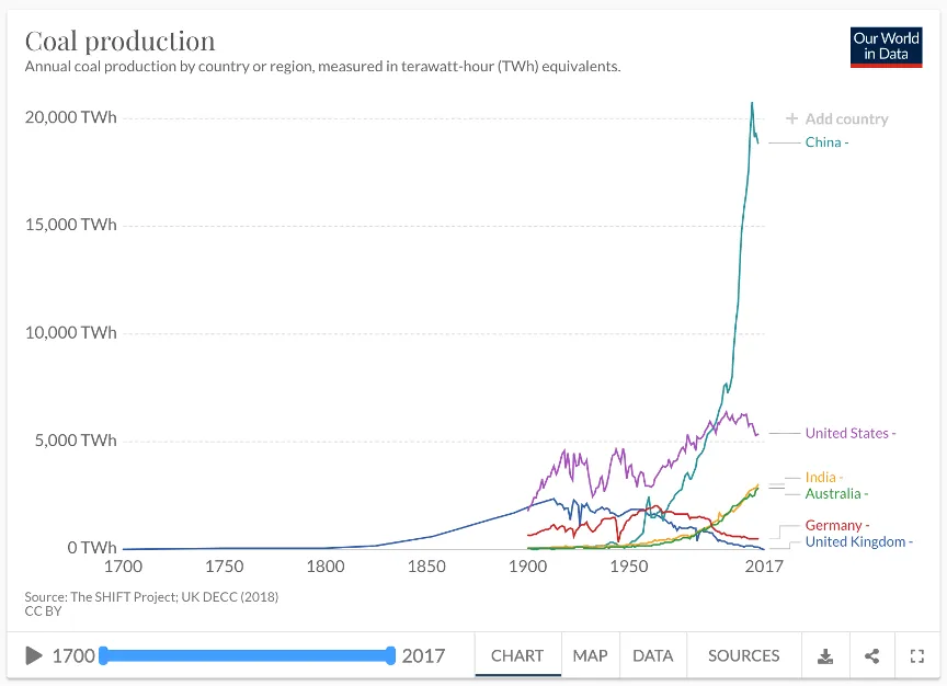 Ezt jól illusztrálja a szén példája. A szén a 18. századi brit ipari forradalom óta a nehézipar szinonimája. A széntermelés negyedévezredes alakulását bemutató diagram jól közelíti a világ ipari történelmét. Nagy vonalakban ez a történelem három fejezetre osztható: az iparosodás előtti korszak; a klasszikus nyugati iparosodás korszaka, amelyet Nagy-Britannia, az Egyesült Államok és Németország uralta, és az 1850-es évektől a 20. század végéig tartott; majd a 21. században kezdődött a kínai korszak.
