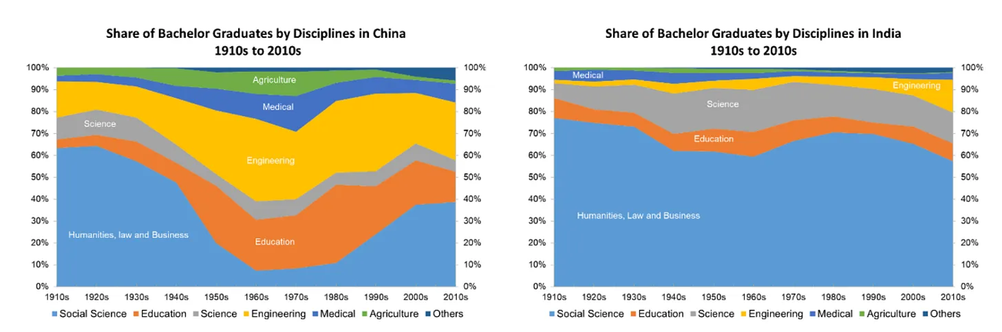 Egyetemi végzettek szakma szerinti megoszlása Kínában és Indiában 1910-2010 között