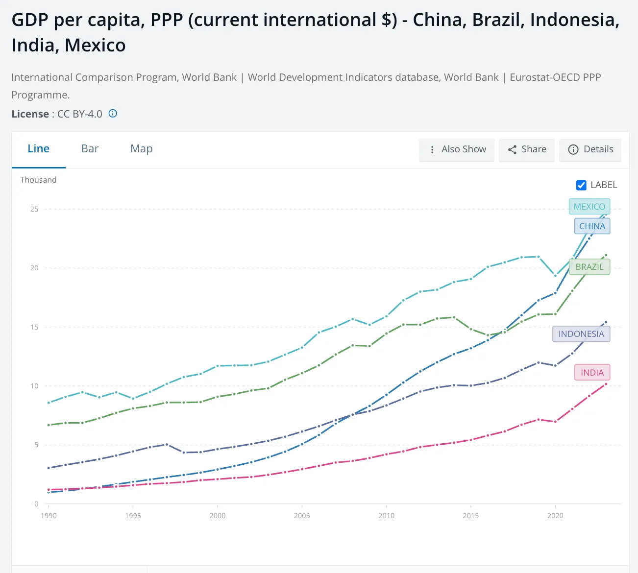 A Világbank statisztikai adatai nem hízelegnek Kínának. Az egy főre jutó GDP alapján Kína valóban meglepően mögötte marad Brazíliának és Mexikónak – ez első ránézésre szokatlan lehet, tekintve Kína óriási gazdasági méretét és ipari kapacitását. A kínai növekedést propaganda célokra semmiképpen sem túlozzák, sőt, anekdoták szerint a releváns nemzetközi bizottságokban dolgozó kínai szakértők keményen dolgoznak azon, hogy olyan PPP-adatokat állítsanak elő, amelyek alulbecsülik országuk fejlődését.
