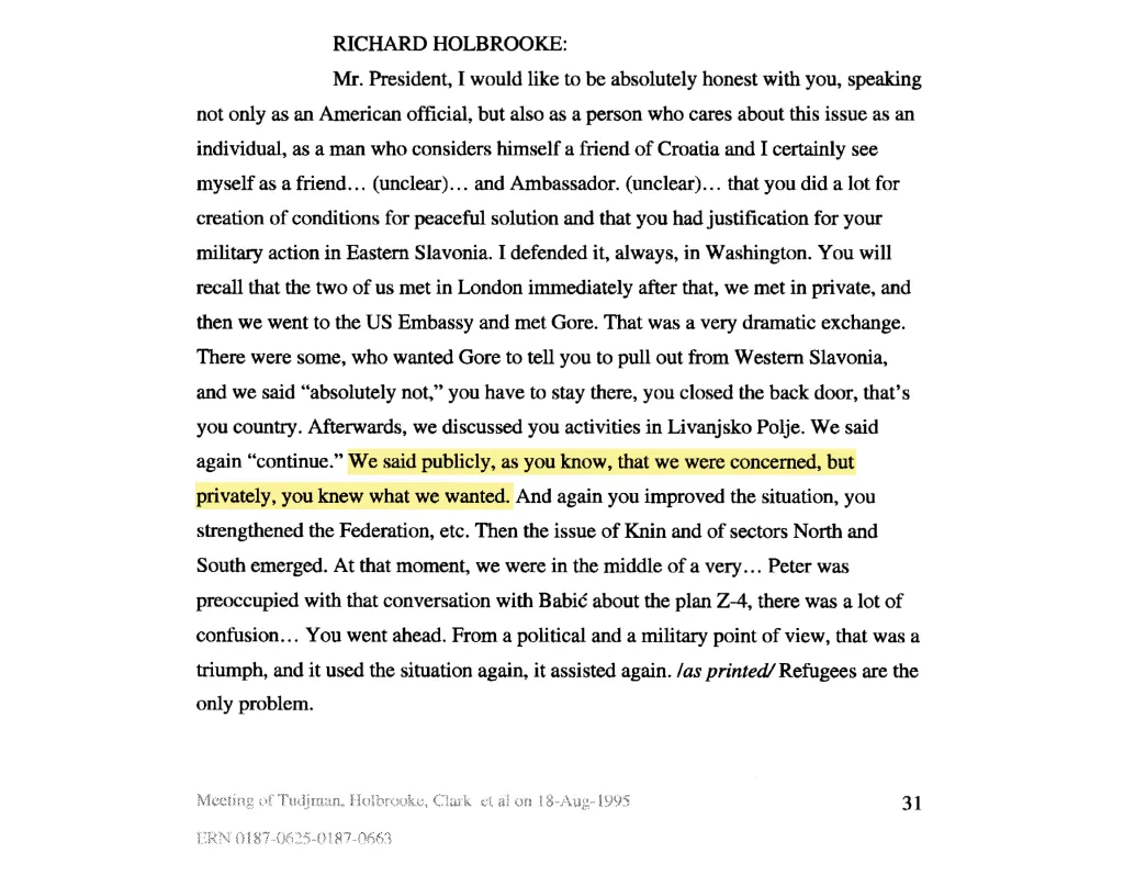 A The Grayzone által áttekintett jegyzőkönyvben Holbrooke alázatosan „a modern Horvátország atyjának”, „felszabadítójának” és „teremtőjének” nevezte Tudjmant. Elismerően megjegyezte, hogy az erős ember „visszaszerezte területének 98 százalékát” – anélkül, hogy megemlítette volna, hogy azt megtisztították a szerbekből –, és az amerikai diplomata „barátjának” nevezte az újonnan függetlenné vált államot, amelynek erőszakos magatartását legitimnek minősítette.