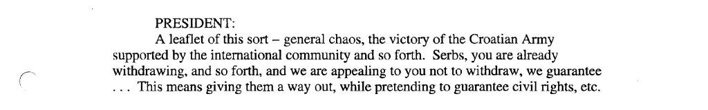 Azoknak a szerbeknek, akik most ellenséges etnikai enklávéban rekedtek, Tudjman tömeges propagandakampányt javasolt, amelynek célja az volt, hogy szórólapokkal hirdesse „a nemzetközi közösség által támogatott horvát hadsereg győzelmét”, és felszólítsa a szerbeket, hogy ne meneküljenek – nyilvánvalóan azzal a szándékkal, hogy befogadó látszatot kölcsönözzen a civil lakosság erőszakos elűzésére irányuló javaslatának. „Ez azt jelenti, hogy kiutat kell adni nekik, miközben úgy teszünk, mintha [kiemelés tőlem] garantálnánk a polgári jogokat... Használjátok a rádiót és a televíziót, de a röpcédulákat is.”