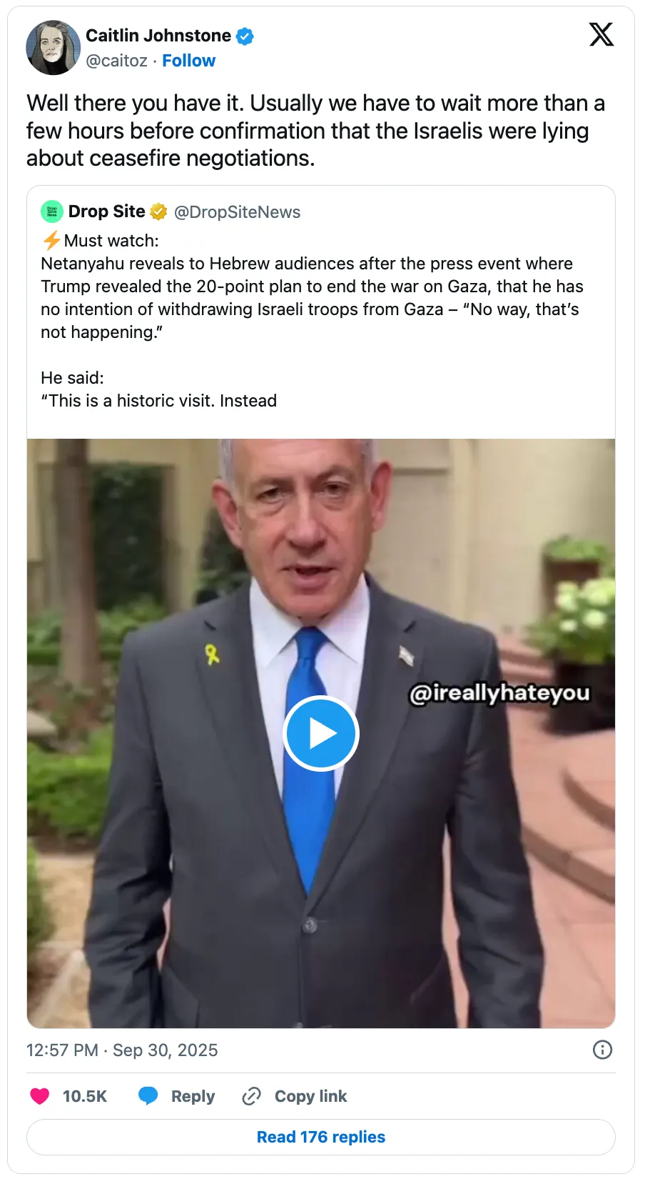 A Trumpanyahu-kormányzat egy „béketervet” szorgalmaz Gázára, amely kritikusai szerint a palesztinokat Izrael állandó uralmára kárhoztatná. A javasolt terv szerint Gázát Trump és a háborús bűnös Tony Blair felügyelné , Netanjahu pedig már most kijelenti , hogy a megállapodás lehetővé teszi az izraeli védelmi erők számára, hogy határozatlan ideig a palesztin területen maradjanak.