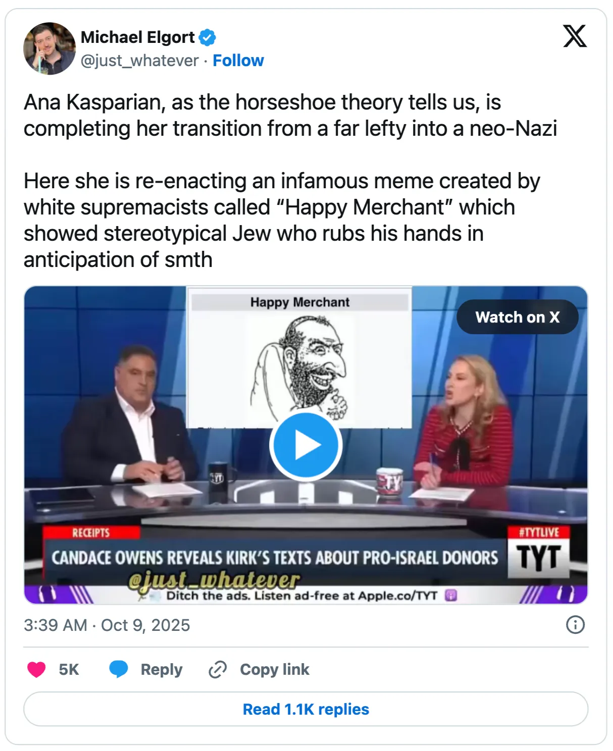 A TYT műsorvezetője, Ana Kasparian a múlt héten forró vízbe került, miután dörzsölgette kezét, s arról beszélt, milyen hátborzongató és gonosz zsidó oligarcha Larry Ellison. A kritikusok pedig sietve az antiszemita „Boldog kereskedő” mémhez hasonlították Ellison ábrázolását.