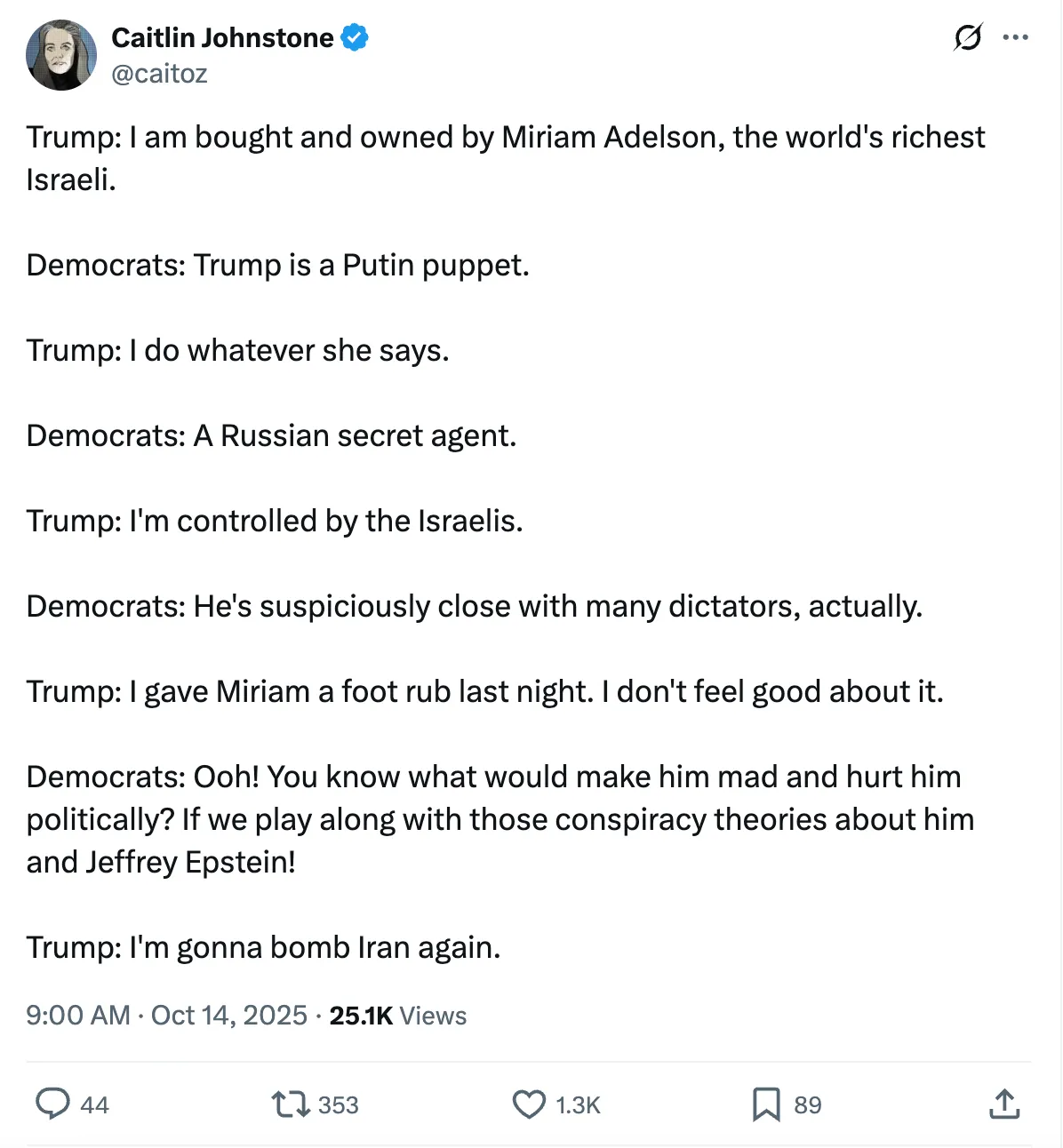 Képzeljük csak el egy pillanatra, hogy valaki kiszivárogtatna dokumentumokat a sajtónak, amelyek bizonyítják, hogy Trump jelentős pénzügyi támogatást kap egy orosz oligarchától, akinek hatalmas geopolitikai következményekkel járó szívességeket osztogatott. Ez lenne az amerikai politikatörténet legnagyobb botránya, kétségtelenül. De mivel egy izraeli oligarcháról van szó, nyíltan és ismételten beismerheti ezt anélkül, hogy bárki is szemet hullatna.