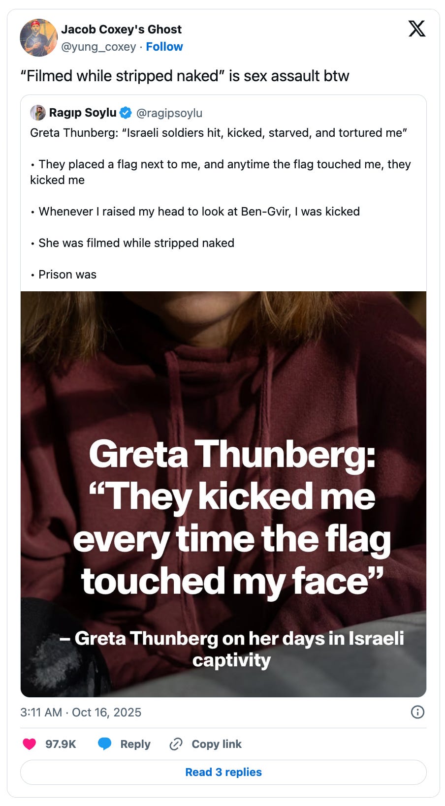 Thunberg kijelentései nemcsak a szemtanúk állításaival vannak összhangban, akik állították, hogy ezeket a dolgokat megtették vele, hanem magának az izraeli kormánynak a kijelentéseivel is.