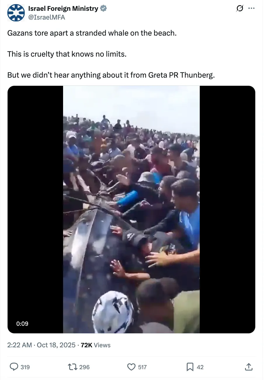 Az elmúlt két év egyik legfurcsább népirtó propagandaakciójaként az izraeli külügyminisztérium hivatalos Twitter-fiókja egy bejegyzést tett közzé, amelyben kétségbeesett, éhező civileket kegyetlen vadembereknek bélyegeztek, azt a hamis állítást felhasználva, hogy „széttéptek” egy „bálnát”, amely a tengerparton „rekedt”.