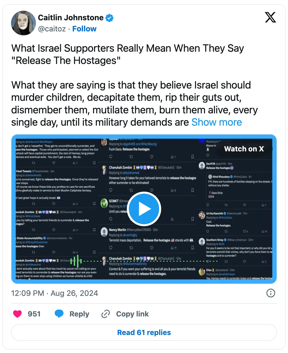 És most azt látjuk, hogy az „Izrael azért öl embereket, mert a Hamásznak izraeli túszai vannak” narratívát pontosan ugyanúgy cáfolják meg, mint az „Izrael azért bombázza a kórházakat, mert mindegyikben van Hamász-bázis” narratívát. A túszok szabadok, de a mészárlások folytatódnak.