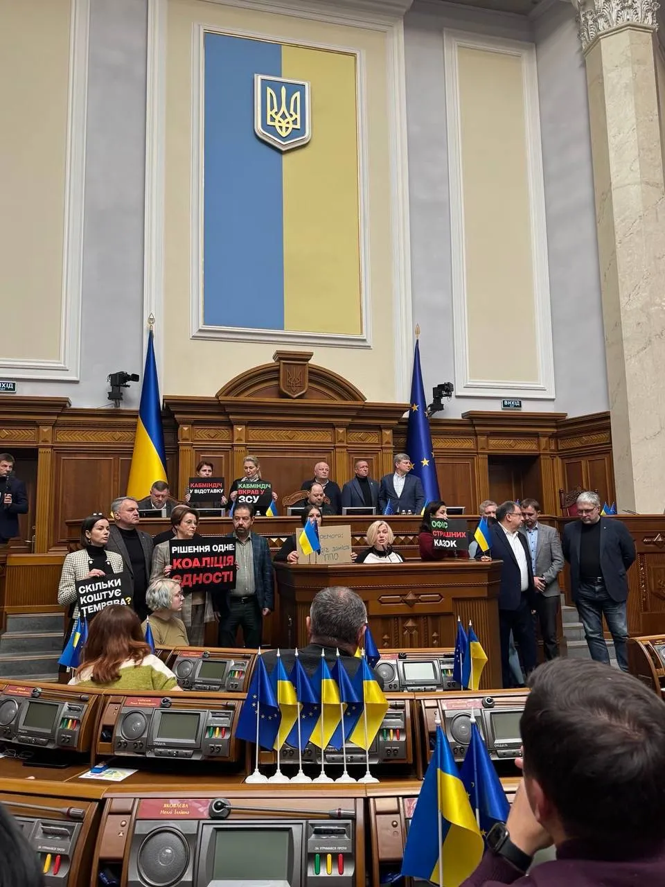 Porosenko pártja mégis csak 26 szavazattal rendelkezik, a szövetséges, még inkább atlanticista (vagy „soros”, ízlés szerint) Holosz pártnak pedig 19 szavazata van a Radában (parlamentben). Timosenko pártjának 25 szavazata van, ami összesen 70 szavazatot jelent a kormány drasztikus átalakítása mellett. Egy döntés elfogadásához 226 szavazat szükséges.
