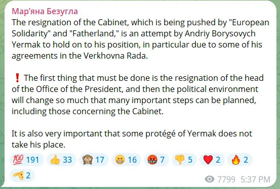 Vannak, akik úgy vélik, hogy az ellenzék többi része összejátszik Jermakkal. Mariana Bezuhla képviselő, aki egészen a közelmúltig Jermak legerősebb katonája volt, most azt állítja, hogy Porosenko Európai Szolidaritás pártja és Timosenko Haza pártja csupán a lényegtelen miniszterek lecserélését célozza, miközben Jermak-ot hatalmon hagyja: