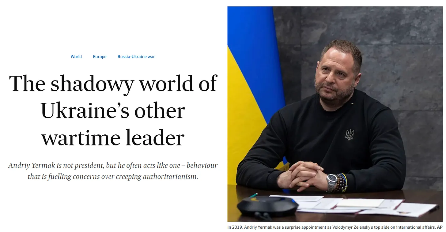Jermak Ukrajna leggyűlöltebb embere, mióta 2019-ben kinevezték. De a nyugati médiaóriások és ukrajnai alvállalkozóik által rá zúdított végtelen bántalmazás-cunami ellenére Jermak folyamatosan erősítette pozícióit. Ezért igyekszem mindig a szkepticizmust megőrizni, amikor Jermak bukásáról beszélek.